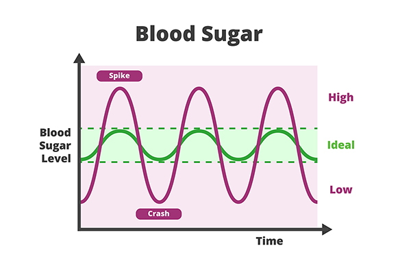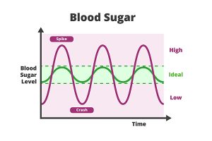 Blood sugar chart. Blood sugar balance levels, blood sugar roller coaster, diabetes. Normal or ideal, low and high unstable levels with spike and crash.
